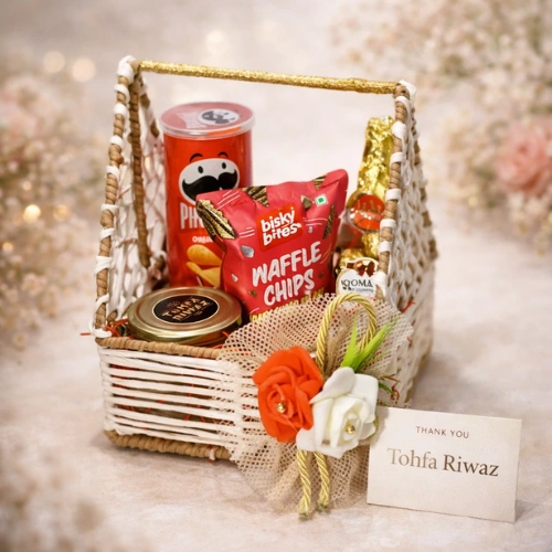 Tohfa Riwaz presents a beautifully arranged decorative basket filled with delicious chocolates and crunchy nuts – perfect for birthdays, anniversaries, corporate gifting, and festive celebrations. Elegant packaging, premium quality, and doorstep delivery in Mohali & Chandigarh.